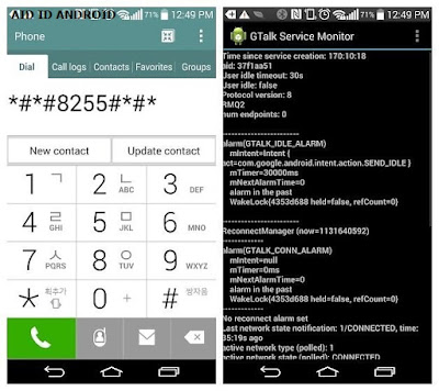 *#*#8255#*#*5. Setelah menekan tombol dial, Anda akan melihat informasi GTalk Service Monitor. Kemudian carilah kata "aid" (Android ID) dan masukkan kode ini dalam setting ekstensi Chrome. AID (baris kedua di sebelah kanan) adalah nomor ID Android Anda, misal "aid:37f1aa51", masukkan kode 37f1aa51 saja di setting ekstensi chrome.